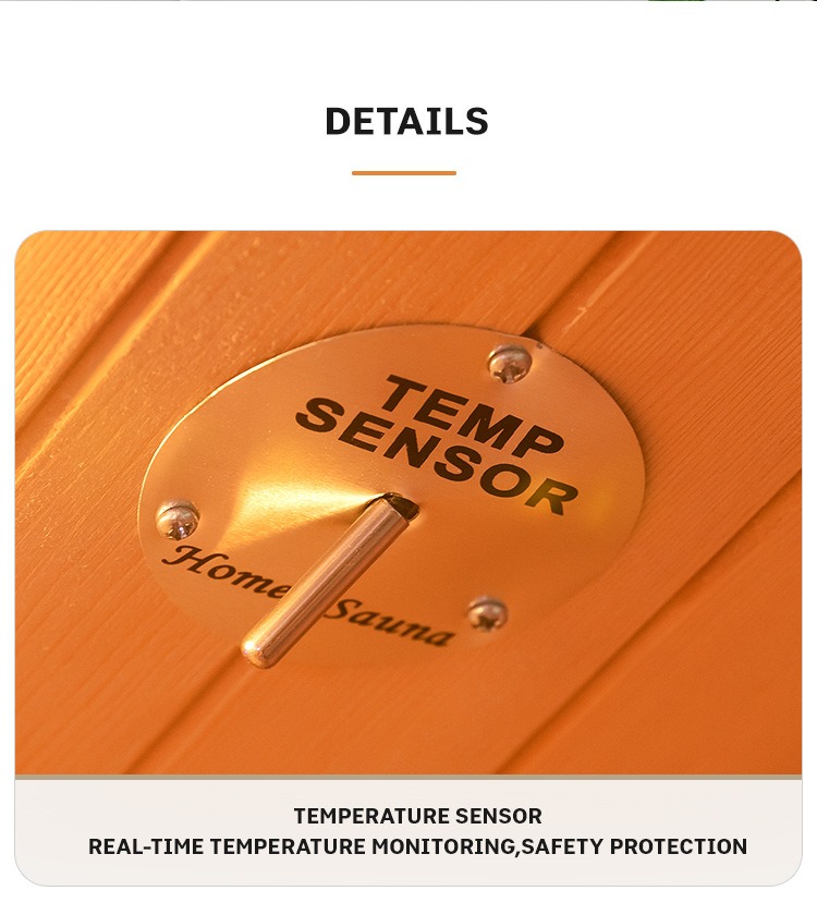 - Reaaliaikainen lämpötilansäätöjärjestelmä: Sisäänrakennettu lämpötila-anturi tarkkailee sisälämpötilaa tarkasti saunan turvallisuuden varmistamiseksi.