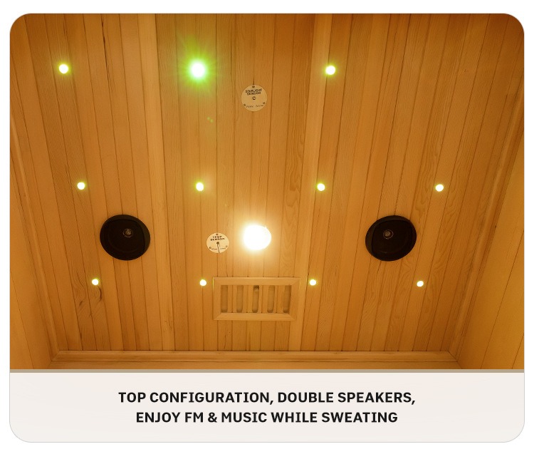 Yläosassa on kaksikaiutinjärjestelmä, joka tukee FM-radiota ja musiikin toistoa. Voit nauttia suosikkimelodioistasi tai radio-ohjelmistasi hikoillen, mikä parantaa mukaansatempaavaa saunaelämystä.