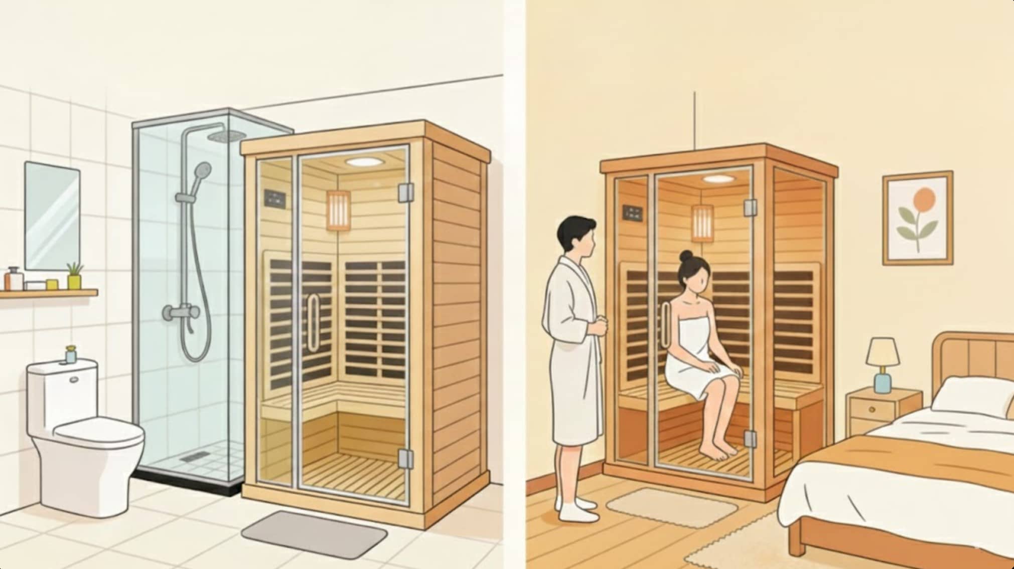 Asennustila: Höyrysaunat vaativat varatut vesi- ja viemäriputket ja niillä on korkeat vaatimukset tilan ilmatiiviydelle (sopii kylpyhuoneremonttiin tai erityisiin tiloihin); kauko-infrapunasaunat eivät vaadi vettä ja viemäriä, vain virtalähdettä. Pienet yhden hengen mallit vievät vain 0,5-1 ㎡ tilaa ja ne voidaan sijoittaa joustavasti makuuhuoneisiin tai parvekkeisiin.