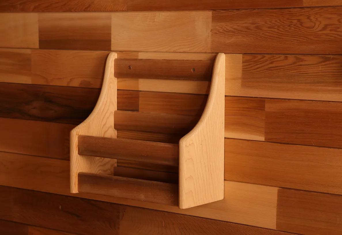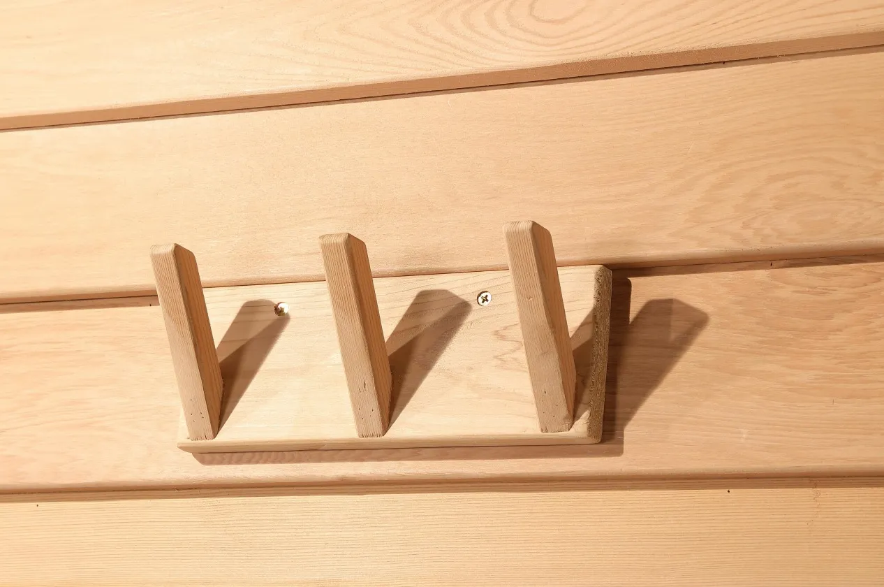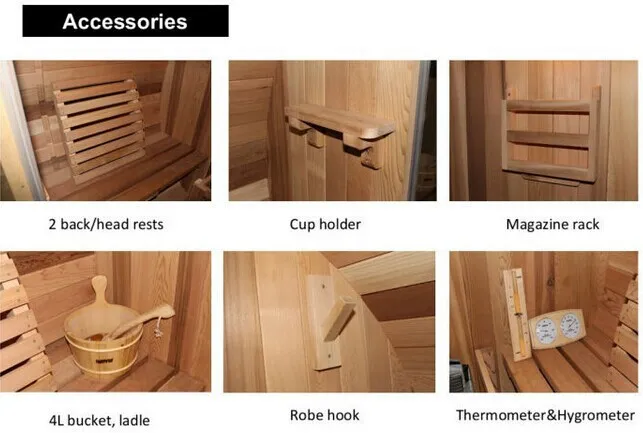 - Mukavuustarvikkeet: Mukiteline, lehtiteline, sisäänrakennettu vaateripustin (vaatteiden ja pyyhkeiden satunnaiseen säilytykseen, eliminoi sotkua saunan aikana);