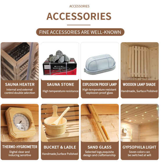 TheUlkona lasiovi ulkona höyryhuoneon varustettu kahdeksalla ydintarvikekategorialla, jotka kattavat saunan koko prosessin tarpeet ja näyttävät laadun yksityiskohtaisesti: