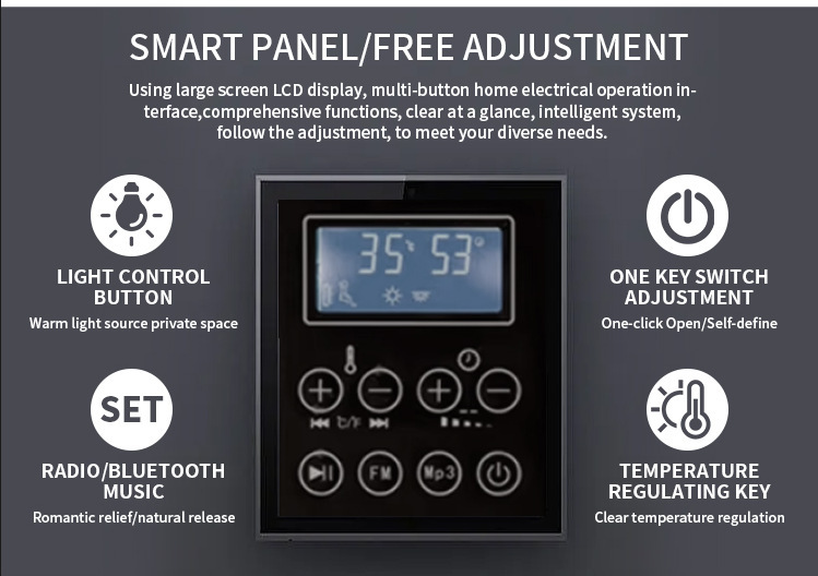 TheUlkona lasiovi ulkona höyryhuoneon varustettu ulkokäyttöön tarkoitetulla suurella LCD-älykkäällä ohjauspaneelilla (veden- ja pölytiivis rakenne), mikä mahdollistaa "yhden näppäimen ohjauksen" kätevän käytön: